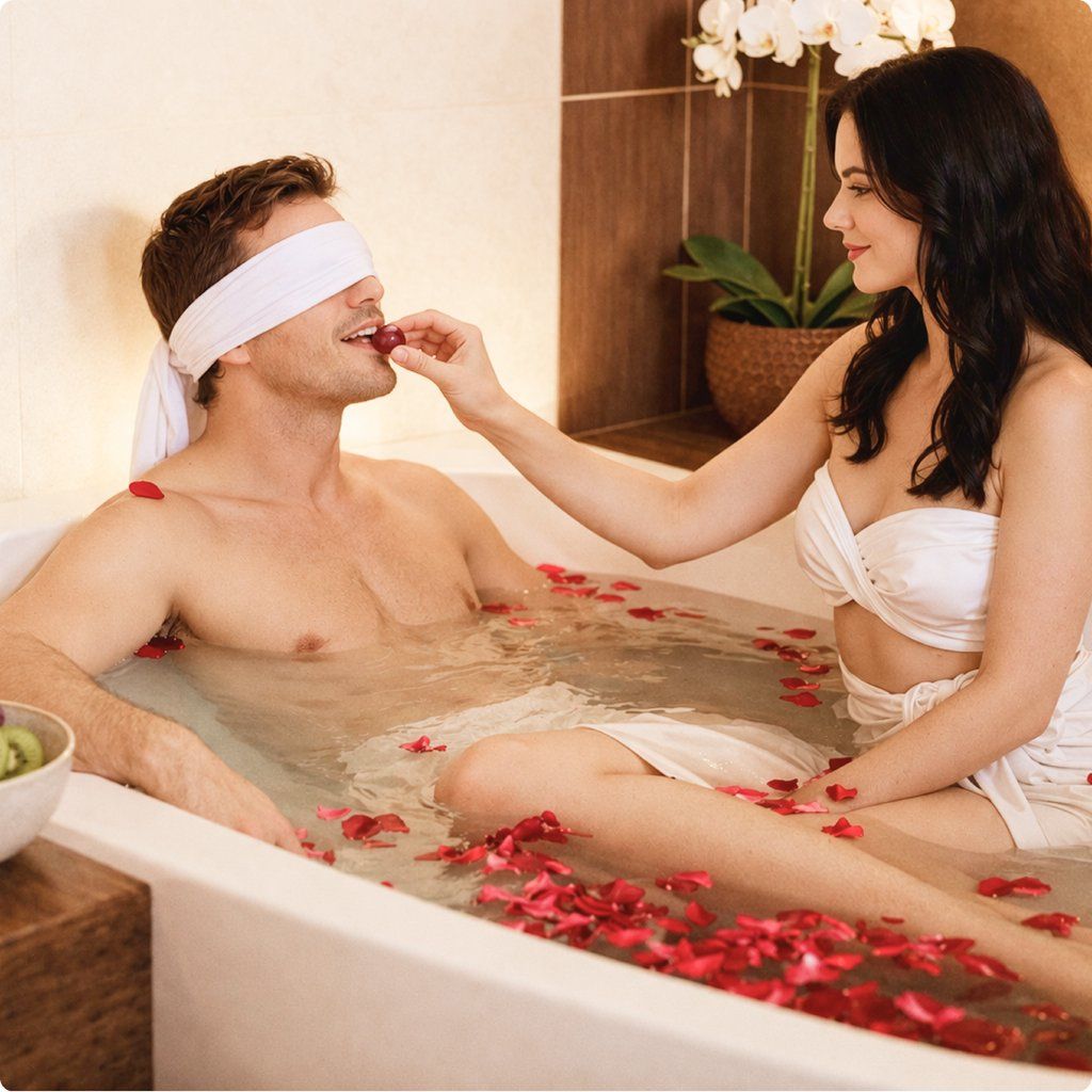 Hlavní částí je rituální koupel s masáží v teplé lázni s růžemi a svíčkami. Teplo vody uvolňuje svaly, zpomaluje dech a vytváří pocit lehkosti. Dotek v této fázi působí přirozeně, klidně a zároveň smyslně.